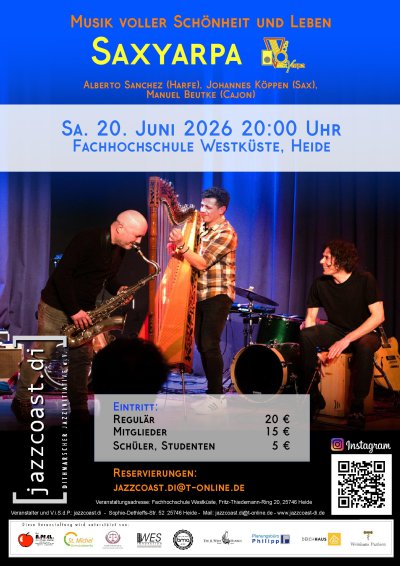 Kartenreservierung wie immer per E-Mail an jazzcoast.di@t-online.de. Die Preise sind 20 Euro für Nichtmitglieder, 15 Euro für Mitglieder, 5 Euro für Schüler/Studenten.